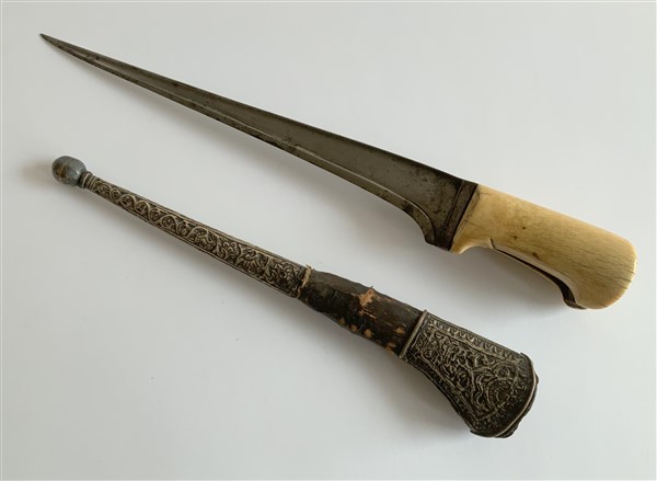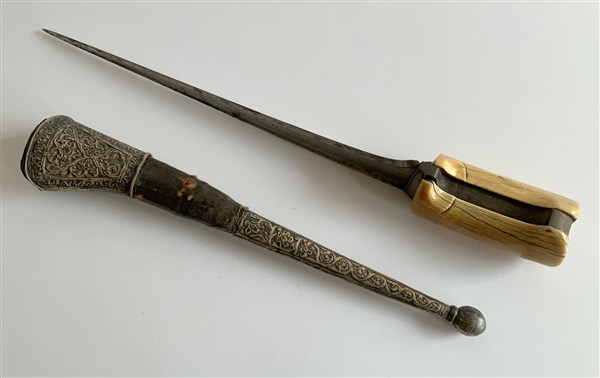 Pugnale dell'India del Nord, lunga lama ad un filo con costa incisa. Impugnatura con due grosse placche di avorio marino, fodero in legno rivestito in pelle con due parti in argento sbalzato e cesellato a motivi floreali. Prima metà del secolo XIX (l. cm 50) (lievi difetti e segni del tempo)