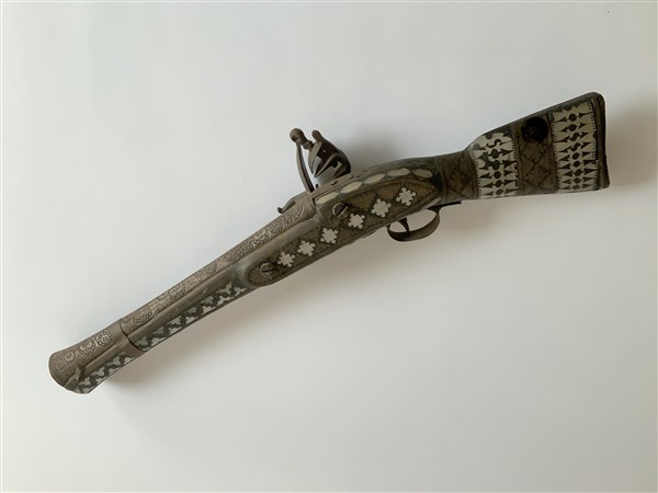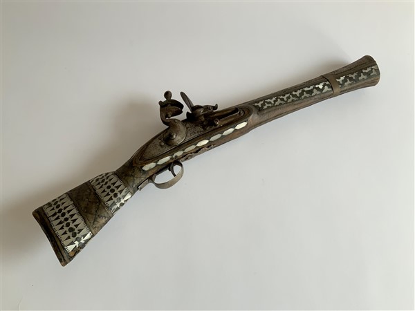 Tromboncino non funzionante di produzione orientale, calcio in legno con intarsi in madreperla lungo tutta la sua estensione. Batteria a pietra focaia di origina belga, della città di Liegi, datata 1806, canna a trombone con varie incisioni. Oggetto di elevata decoratività Probabilmente Turchia, prima metà del secolo XIX (l. cm 56) (non funzionante, difetti e leggere mancanze)