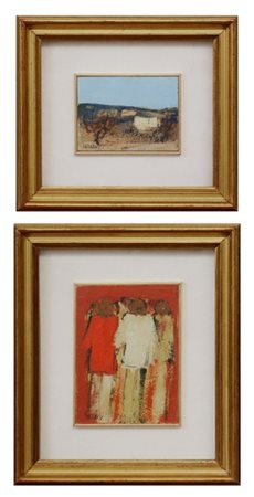 Lotto di due dipinti ad olio raffiguranti paesaggio e figure, misure diverse, firmati, in cornici