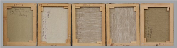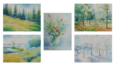 lotto di cinque dipinti ad olio su tela (cm30x40) raffiguranti paesaggi e vaso con fiori, firmati in basso a sinistra, firmati, titolati, datati e autenticati al retro