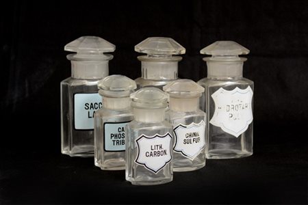 Gruppo di sei bottiglie da farmacia in vetro con tappi sfaccettati (h cm 17 e 12,5) (difetti)
