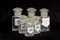 Gruppo di sei bottiglie da farmacia in vetro con tappi sfaccettati (h cm 17 e 1