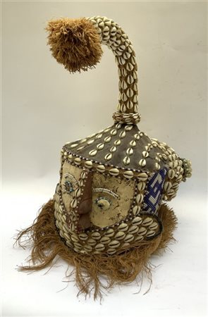 Copricapo rituale africano in tessuto, paglia, perline e conchiglie (h cm 45) (difetti)