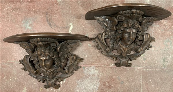 Coppia di mensole in legno di rovere scolpito raffiguranti angeli cherubini con