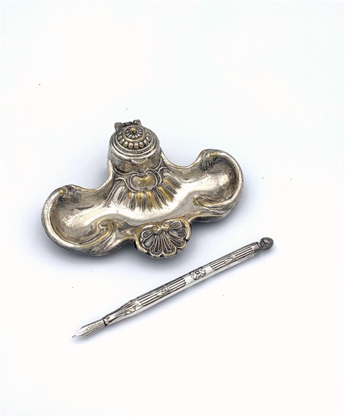 Lotto composto da una penna stilografica in argento 925 cesellata a motivi floreali unita ad un calamaio in metallo argentato sbalzato e scanalato (lievi difetti)