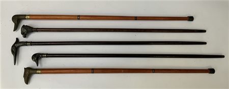 Gruppo di cinque bastoni da passeggio con pomelli a soggetto ornitologico di cu