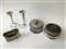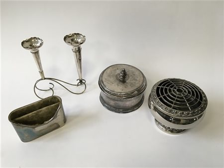 Lotto composto da una scatola di forma circolare con coperchio e presa a trottola, un posacenere decorato a motivi stilizzati nelle bordure, una tulipaniera e un porta dcumenti, in metallo argentato (lievi difetti)