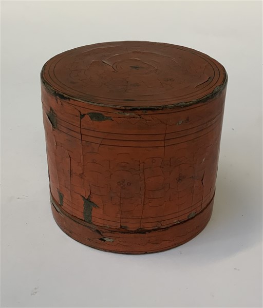 Manifattura orientale, scatola in papier machè laccata rossa (difetti e mancanz