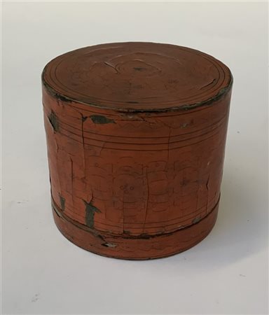 Manifattura orientale, scatola in papier machè laccata rossa (difetti e mancanze)