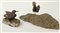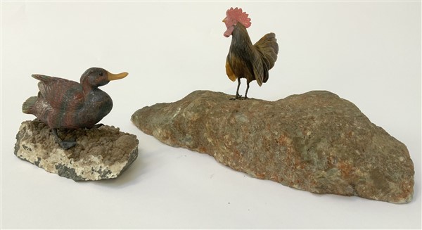 Lotto di due sculture in pietra dura raffiguranti un gallo e un'anatra su basi in pietre minerali (h max cm 13) (difetti)