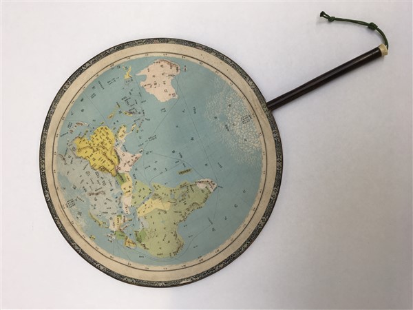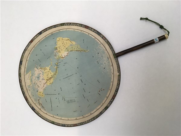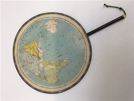 Ventaglio cinese a ventola con pagine a planisfero politico stampato su tessuto (d cm 28, l cm 42) (difetti)