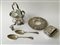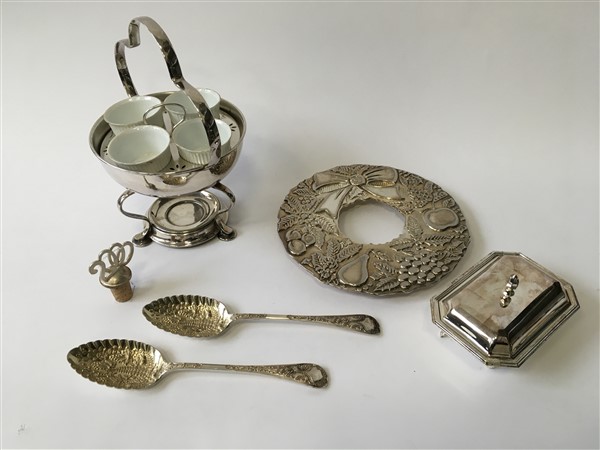Lotto composto da un set per fonduta con ciotoline in ceramica bianca, una saliera con presa del coperchio a pigna, un'alzata cesellata a motivi natalizi, un tappo decorato con il numero "2000" in rilievo e una coppia di cucchiai da servizio cesellati a motivi floreali, in metallo argentato (lievi difetti)