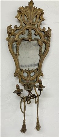 Ventola di forma mossa a tre luci in legno dorato e intagliato a motivi vegetali. Secolo XVIII (h. cm 65) (difetti)