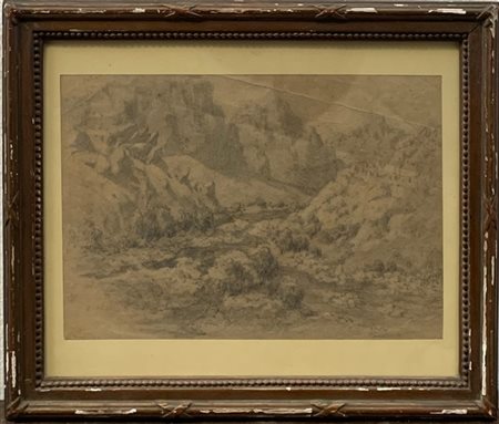 "Paesaggio alpestre" disegno a matita su carta (cm 22x33) Firmato in basso a destra. In cornice (difetti)