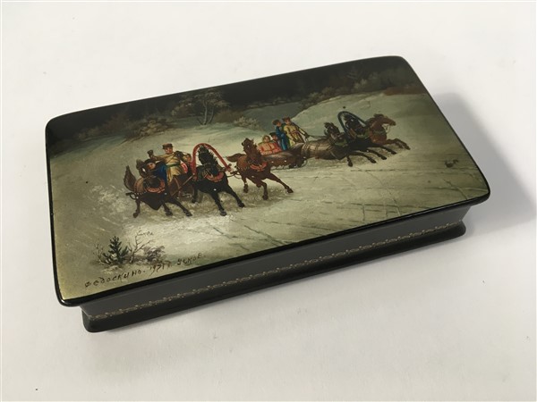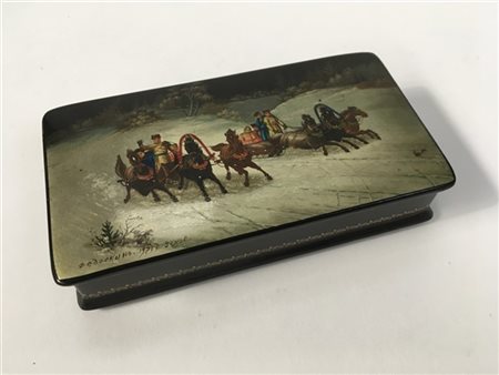 Arte russa del secolo XX, scatola in legno dipinto e laccato, coperchio decorato a gara di slitte, firmata e datata 1971 in basso a sinistra