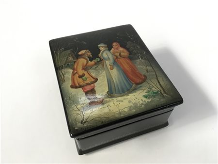 Arte russa del secolo XX, scatola in legno dipinto e laccato, coperchio decorato con figure all'aperto, firmata alla base (cm 10,2x5,8x12,3)