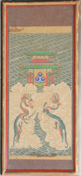 Dipinto su garza applicata su carta raffigurante pagoda e draghi (difetti)