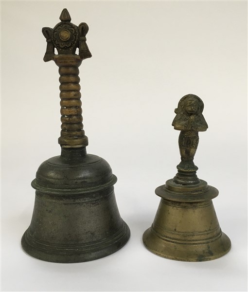 Lotto composto da due campanelli nepalesi in bronzo e ottone (h max cm 24) (lie