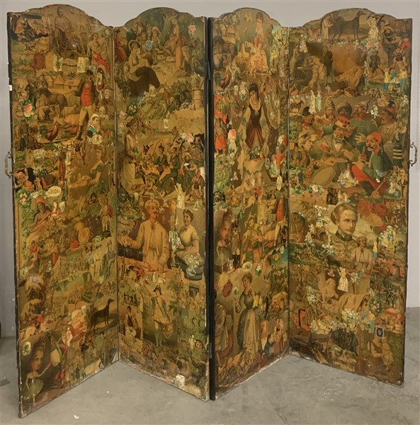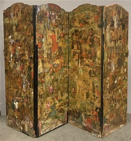 Paravento a quattro ante in stoffa decorato su ambo i lati a figure vittoriane, secolo XIX (cm 240x180) (gravi difetti)