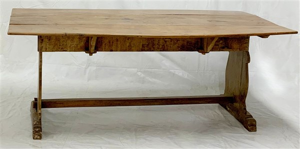 Antico tavolo a bandelle con sostegni sagomati riuniti da traversa (aperto cm 195x79x100) (difetti e restauri)