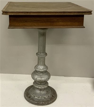 Tavolo da nave con piano in mogano di forma quadrata e base a colonna in ghisa argentata. (cm 60x80x60) (difetti)