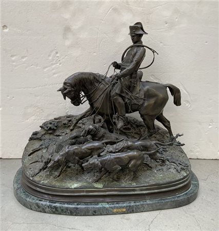 "Fox Haunt" grande scultura in bronzo poggiante su base in marmo (h cm 68) Firmata e datata 1869 alla base (difetti e mancanze)
