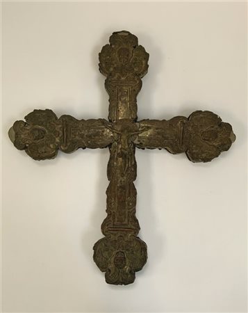 Croce sbalzata in rame con raffigurati al verso Gesù Cristo crocifisso e al ret