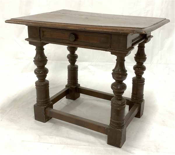 Antico tavolino con gambe tornite riunite da traverse e un cassetto nella fasci