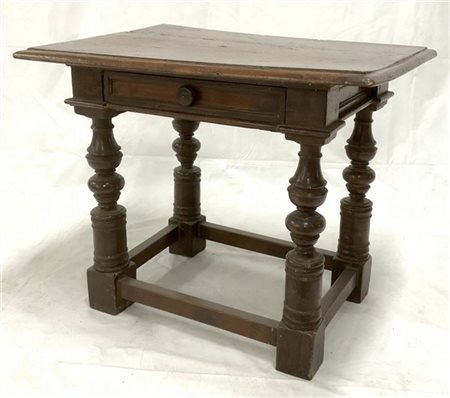 Antico tavolino con gambe tornite riunite da traverse e un cassetto nella fascia (cm 79x65x57) (difetti)