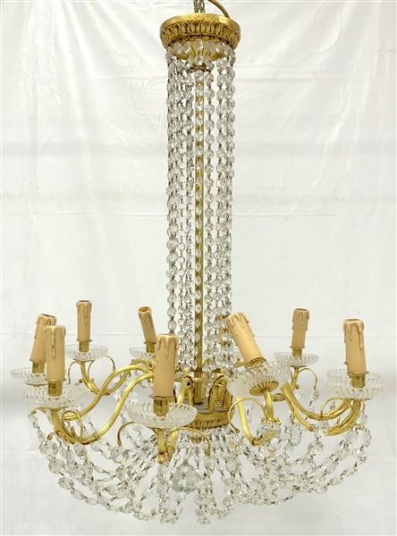Lampadario a cesto in metallo dorato a dieci braccia, decorato con pendagli in vetro (difetti)