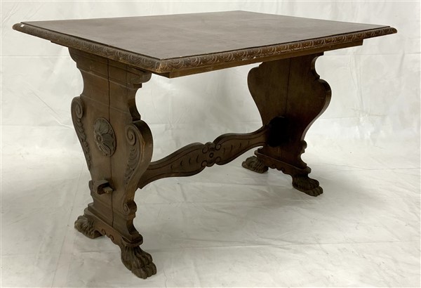 Tavolo neorinascimentale con sostegni ad asso di coppe riuniti da traversa (cm