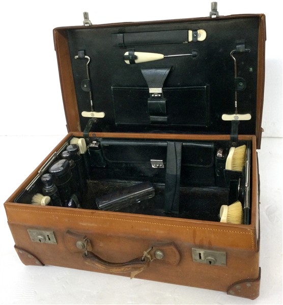 Bella valigia in cuoio, interno in saffiano verde, con accessori da toilette in vetro e avoriolina (difetti e mancanze)