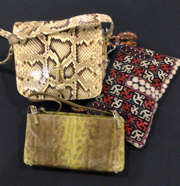 Lotto di due borsette in rettile di diversi colori uniti a una tracollina in tessuto ricamato etnico (cm 20) (difetti e segni d'uso)
