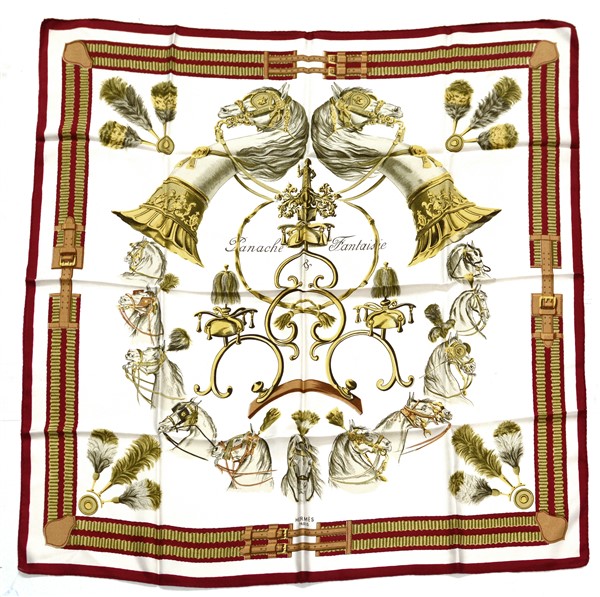 HERMÈS Foulard in seta "Panache & Fantaisie", Hugo Grygkar 1959, fondo bianco