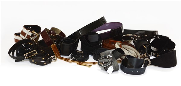 Lotto composto da ventitre cinture in pelle, raso, metallo e galalite, diversi colori e fogge e misure (tg. 40) (cm 46) (lievi segni d'uso)