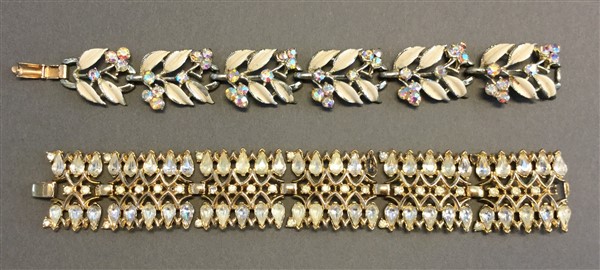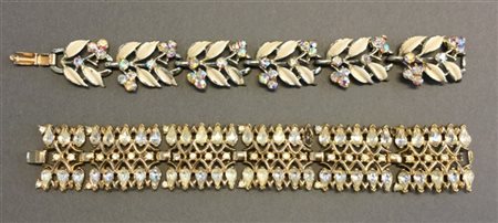 Lotto composto da due braccialetti in metallo color oro o argento con strass e smalti (lievi difetti e mancanze)