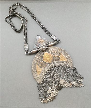 Collana etnica in argento con motivo a mezzaluna e applicazioni color oro (difetti e mancanze)