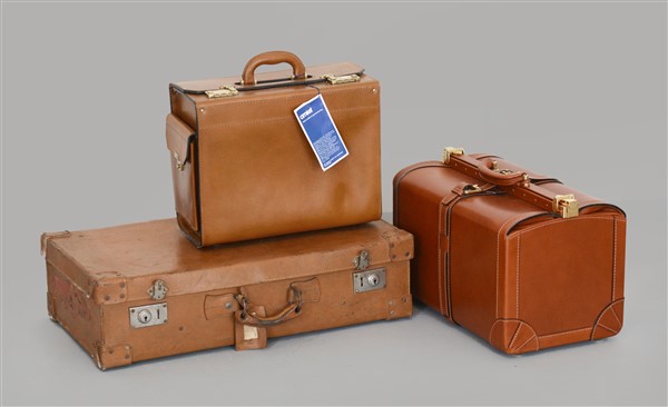 Lotto composto da due borsoni da viaggio capienti in pelle e cuoio, dettagli in metallo color oro e una valigia, misure diverse (difetti e segni d'uso)