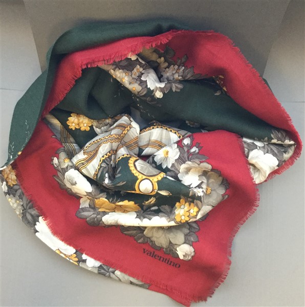 Granfoulard in lanetta floreale, base verde scuro, bordo bordeaux chiaro (lievi difetti)