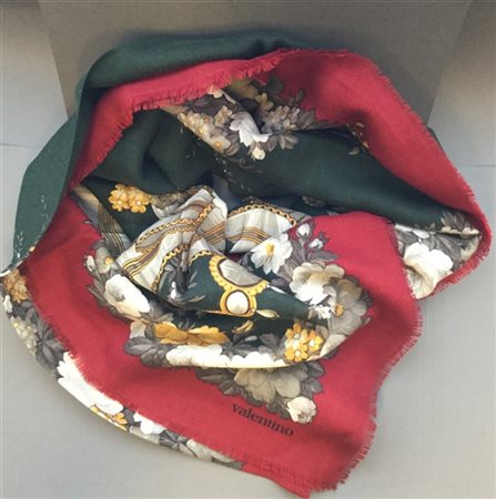 VALENTINO Granfoulard in lanetta floreale, base verde scuro, bordo bordeaux ch
