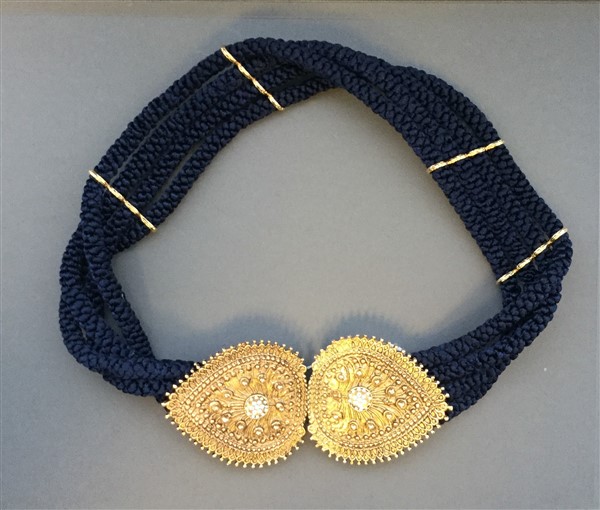 Cintura ispirata a Saint Laurent in passamaneria con importante fibbia in metatto color oro e strass (difetti e segni d'uso)