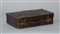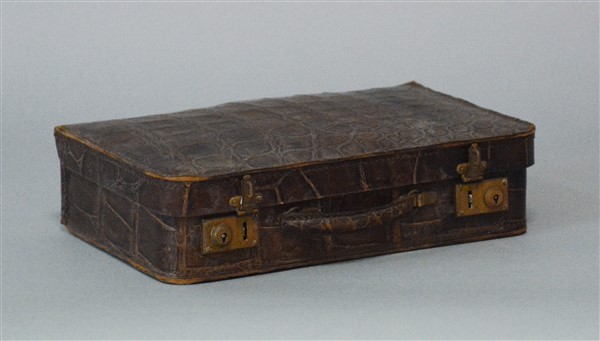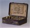 Valigetta/necessaire da viaggio in cuoio stampato cocco, completo di accessori in vetro con tappi in metallo color ottone (cm 36x9x22) (difetti e segni d'uso)