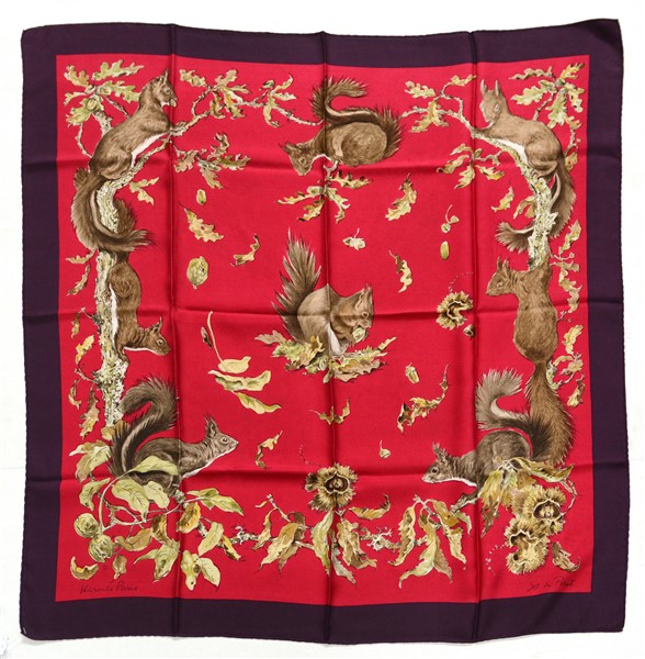 HERMÈS Foulard in seta "Ecureuils", Xavier De Poret 1967, fondo amaranto bordo