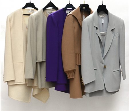 Lotto composto da cinque tailleur, giacca con gonna, alcuni con bottoni gioiello in diversi colori, materiali e modelli (tg. 42-46) (lievi difetti, segni d'uso)