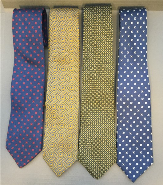 HERMÈS Lotto di 4 cravatte nei toni del blu, verdone e rosso (lievi segni d'us