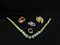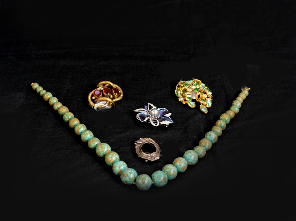 Lotto di bigiotteria composto da una collana di boules a scalare in pietra dura e quattro broches in diversi materiali di cui una in argento con pietre dure e/o strass colarati (difetti e mancanze)