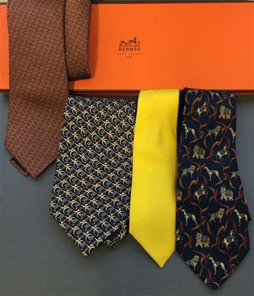 Lotto di quattro cravatte in seta di diversi colori e misure, la cravatta di Hermès con scatola originale (difetti e segni d'uso)