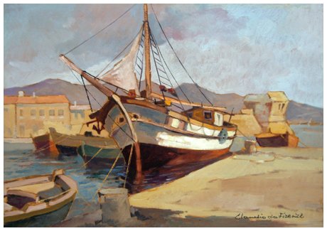 CLAUDIO DA FIRENZE (Claudio Domenici) Firenze 1943 Tartana all’ormeggio Olio su tavola 35 x 50. Firma in b. a d.; sul verso firma e titolo.
