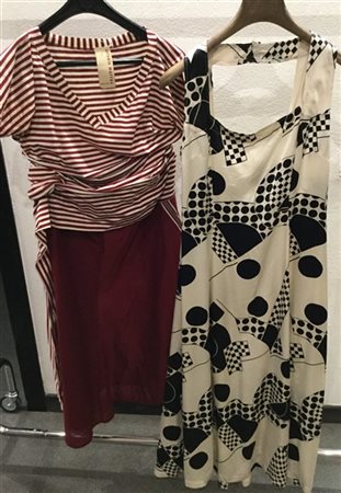 Lotto composto da un completo, gonna con maglietta nei toni del bordeaux e bianco in cotone e un vestito di sartoria in seta realizzato in seta firmata Christian Dior (tg. 44) (difetti e segni d'uso)