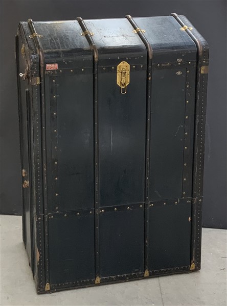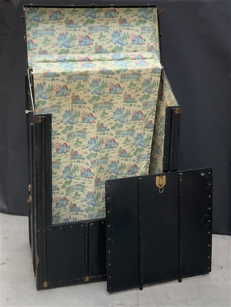 Baule porta abiti in legno rivestito in similpelle nera, interno foderato in tessuto fiorato Milano 1940 ca (cm 60x155x100) (difetti)